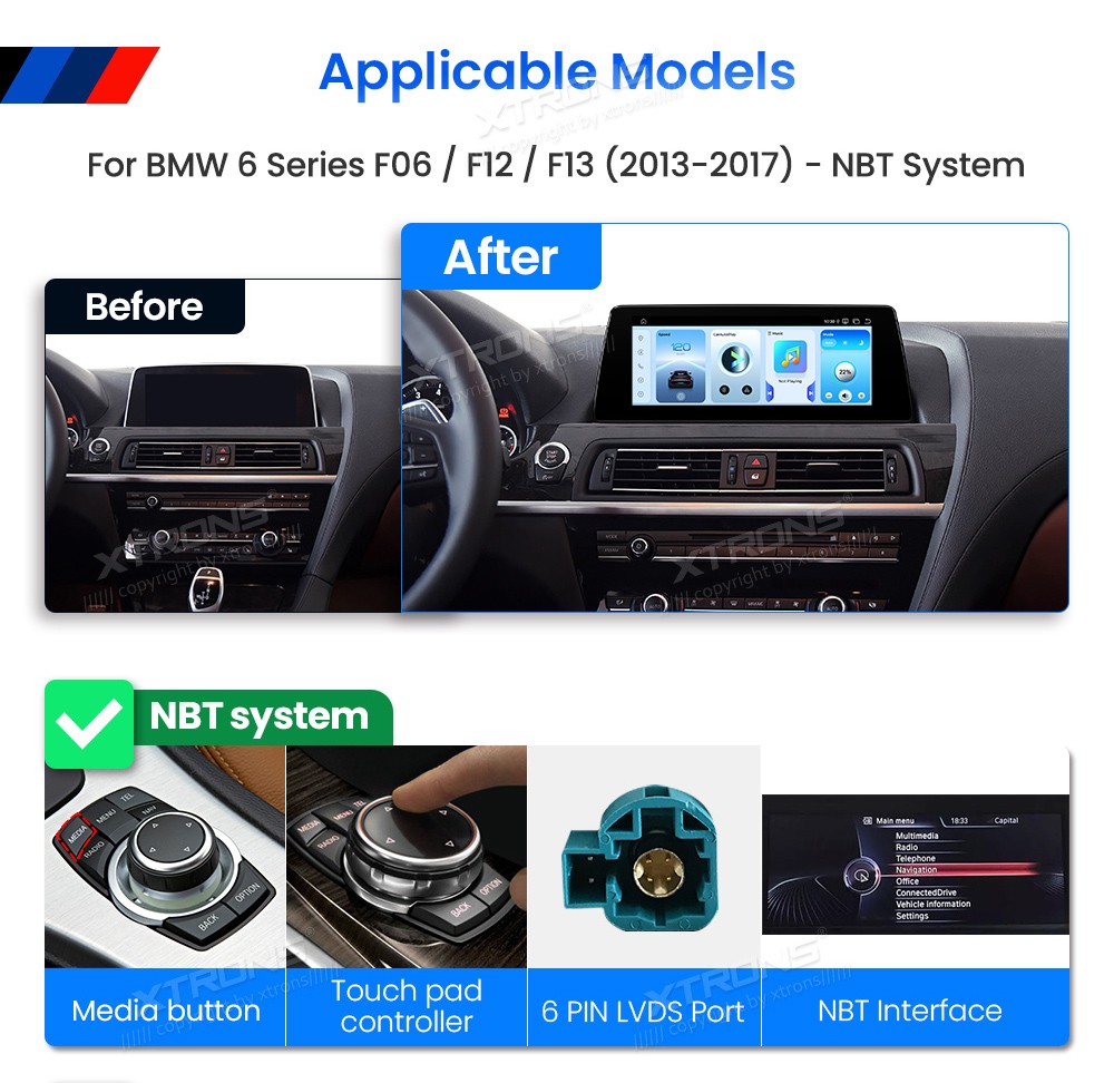 XTRONS QBBH14NB12SX 10.25" BMW 6 Seeria F06, F12, F13 NBT Multimeedia Android Octa-Core 4G BMW 6 Seeria F06, F12, F13 (2013-2017) (Sobib, kui sõidukil on NBT süsteem.)Tarkvara: Android10.25" HD puuteekraan 1920*720px, IPS HD G+GProtsessor Qualcomm Octa-Core 64bit 2.0GHzMuutmälu DDR4 8 ...