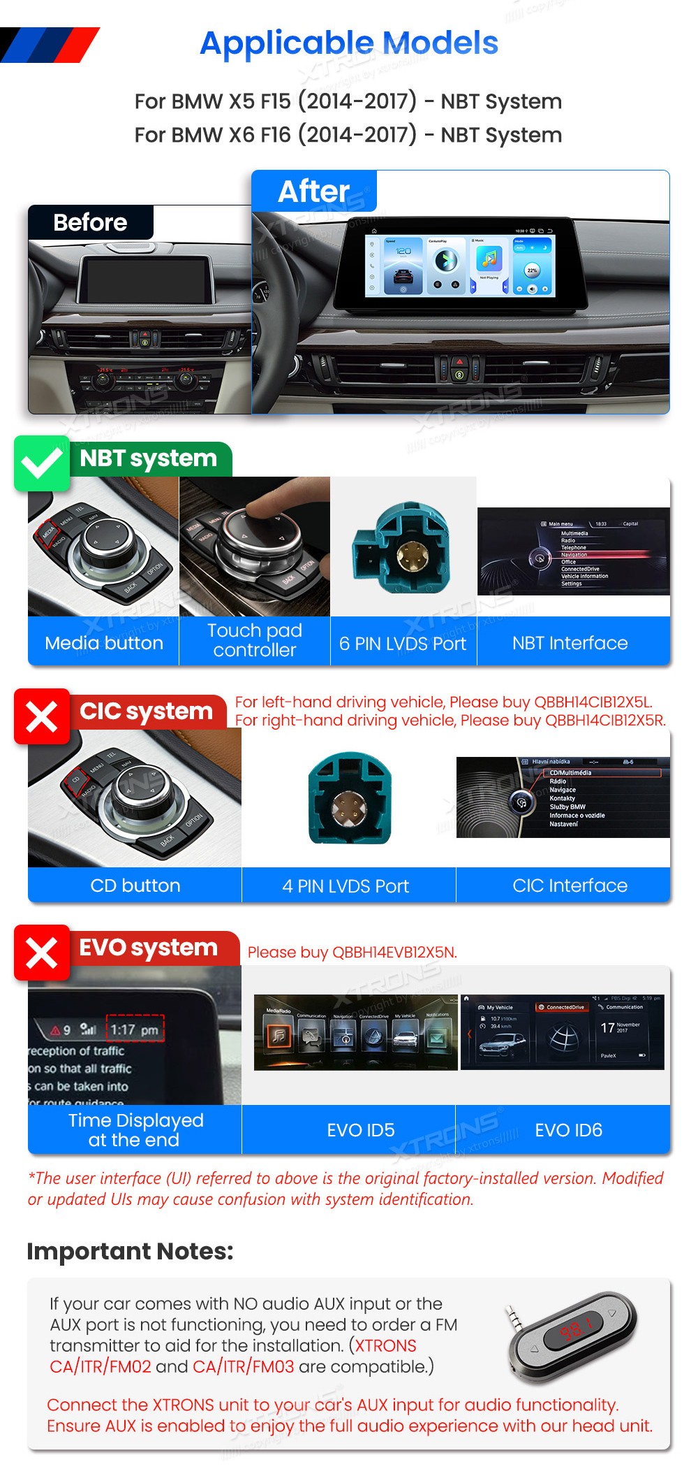 XTRONS QBBH14NB12X5N 10.25" BMW X5 F15, X6 F16 NBT Multimeedia Android Octa-Core 4G BMW X5 F15 (2014-2017)BMW X6 F16 (2014-2017)(Sobib, kui sõidukil on NBT süsteem.)Tarkvara: Android10.25" HD puuteekraan 1920*720px, IPS HD G+GProtsessor Qualcomm Octa-Core 64bit 2.0GHzMuutmälu DDR4 8GB, UFS2.2 1 ...