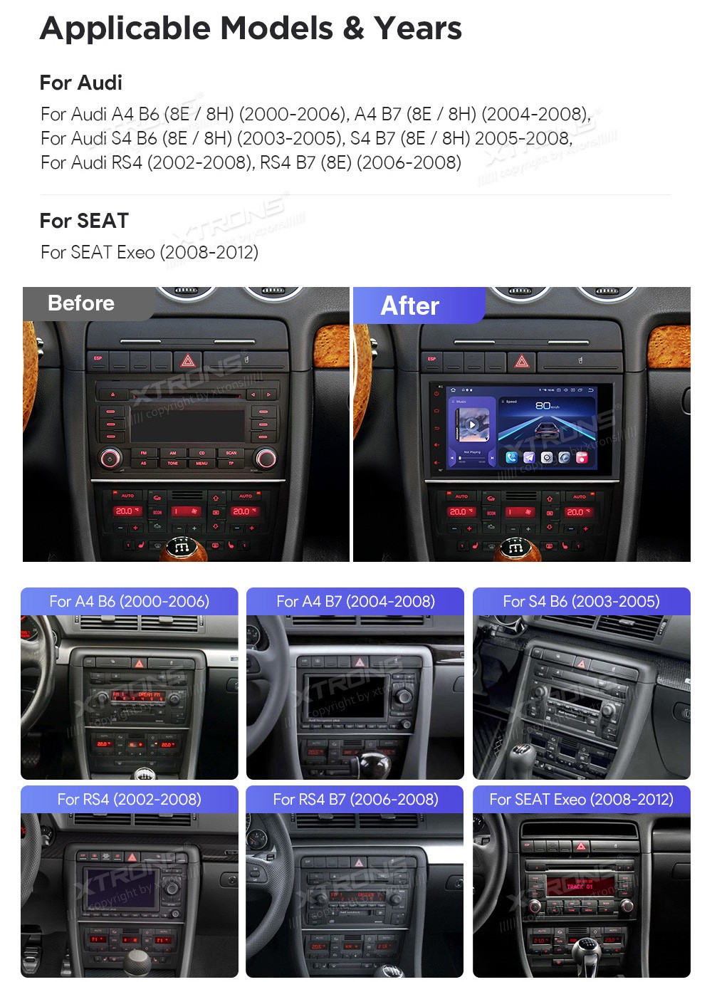 XTRONS IQ84A4AP 8.0" AUDI A4, S4, RS4 Multimeedia Android 14.0 Octa Core 4G HDMI Audi A4 B6 (8E / 8H) (2000-2006), A4 B7 (8E / 8H) (2004-2008), S4 B7 (8E / 8H) (2005-2008), S4 B6 (8E / 8H) (2003-2005), RS4 (2002-2008), RS4 B7 (8E) (2006-2008), SEAT Exeo (2008-2012)Tarkvara: Android 14.08.0" HD p ...