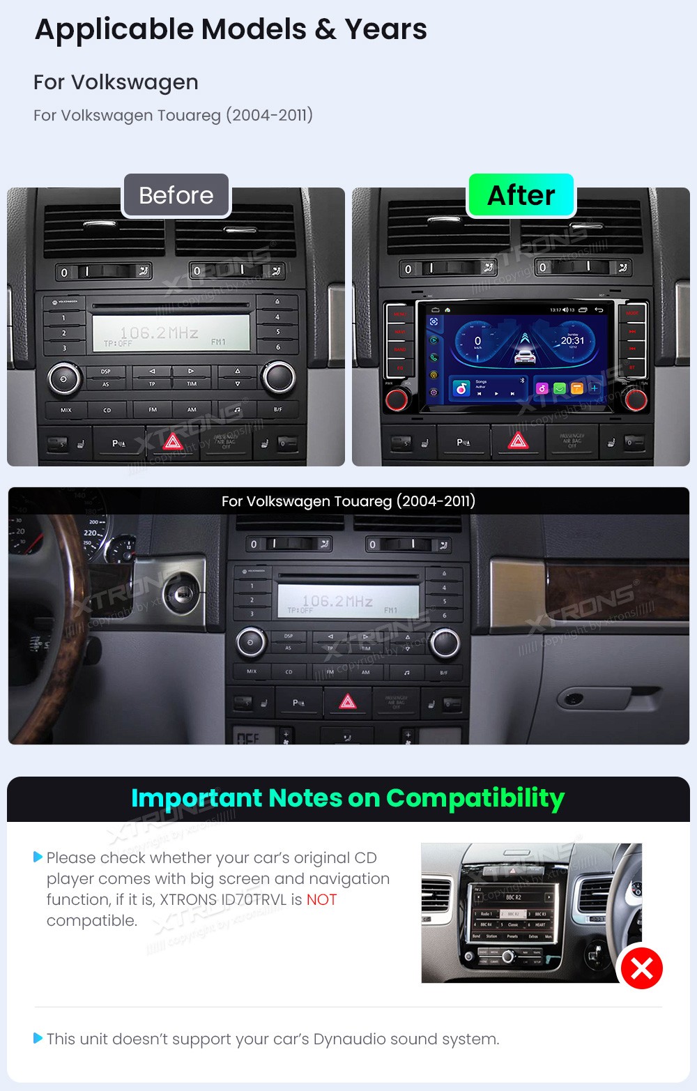 XTRONS ID70TRVL 7.0" Volkswagen Touareg Multimeedia Android 14 Octa-Core 4G Volkswagen Touareg (2004-2011) Ei toeta Dynaudio helisüsteem!Tarkvara: Android 147.0" HD puuteekraan 1024*600px, G+G IPSProtsessor 8xCortex-A55 Octa-Core 64bitMuutmälu DDR4 4GB, 64GB sisemäluGPS NavigatsioonCAR AutoPlay (Blu ...