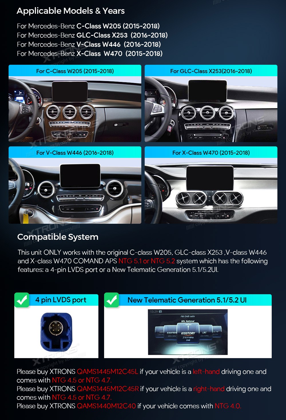 XTRONS QAMS1450M12C5 10.25" Mercedes-Benz W205, X253, W447, W470 5.1, 5.2 Multimeedia Android 14 Octa-Core 4G Mercedes-BenzC-Class W205 (2015-2018) NTG 5.1, NTG 5.2GLC-Class X253 (2016-2018) NTG 5.1, NTG 5.2V-Class W447 (2016-2018) NTG 5.1, NTG 5.2X-Class W470 (2015-2018) NTG 5.1 ...