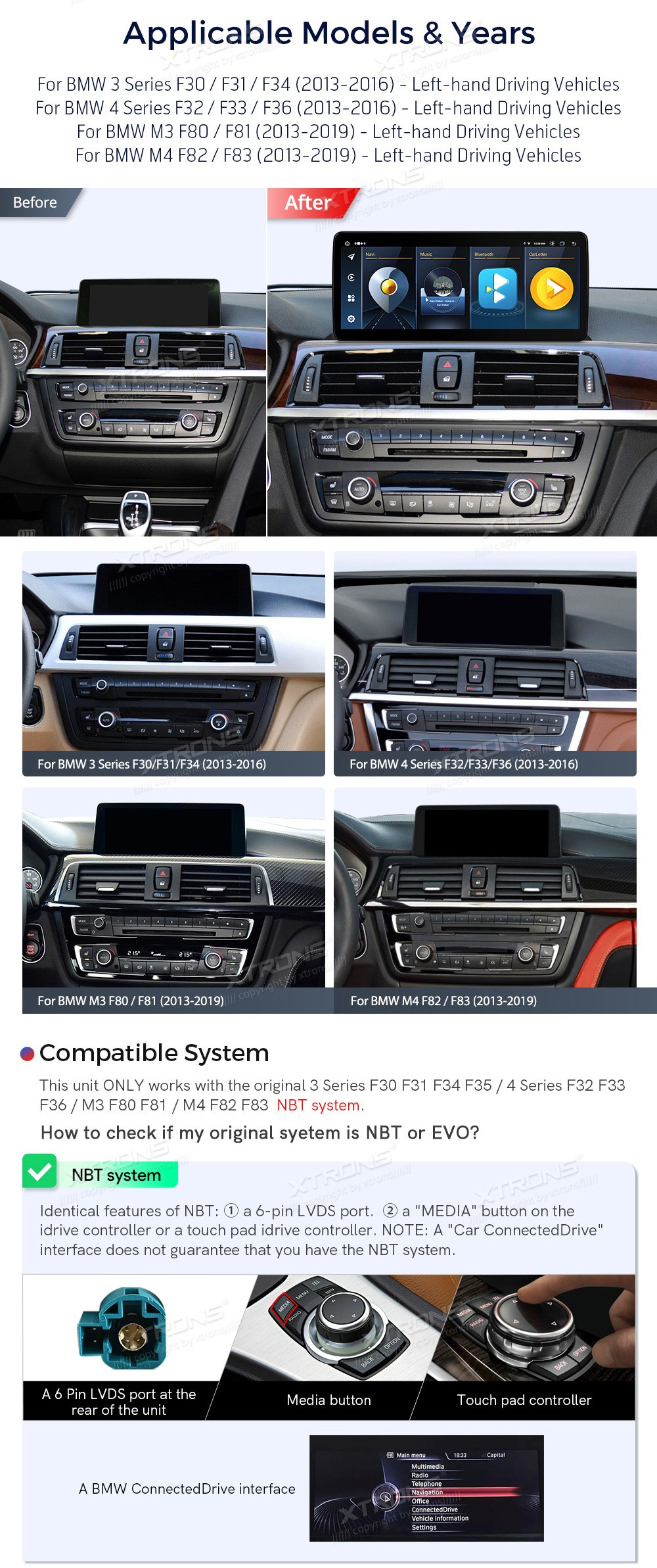 XTRONS QLB22NBTHL 12.3" BMW 3, 4 Seeria M3, M4 NBT Multimeedia Android 14.0 Octa-Core 4G BMW 3 Series F30, F31, F34 (2013-2016)BMW 4 Series F32, F33, F36 (2013-2016)BMW M3 F80, F81 (2013-2019)BMW M4 F82, F83 (2013-2019)(Sobib, kui sõidukil on NBT süsteem.)Tarkvara: Android 14.012.3" HD puuteekr ...
