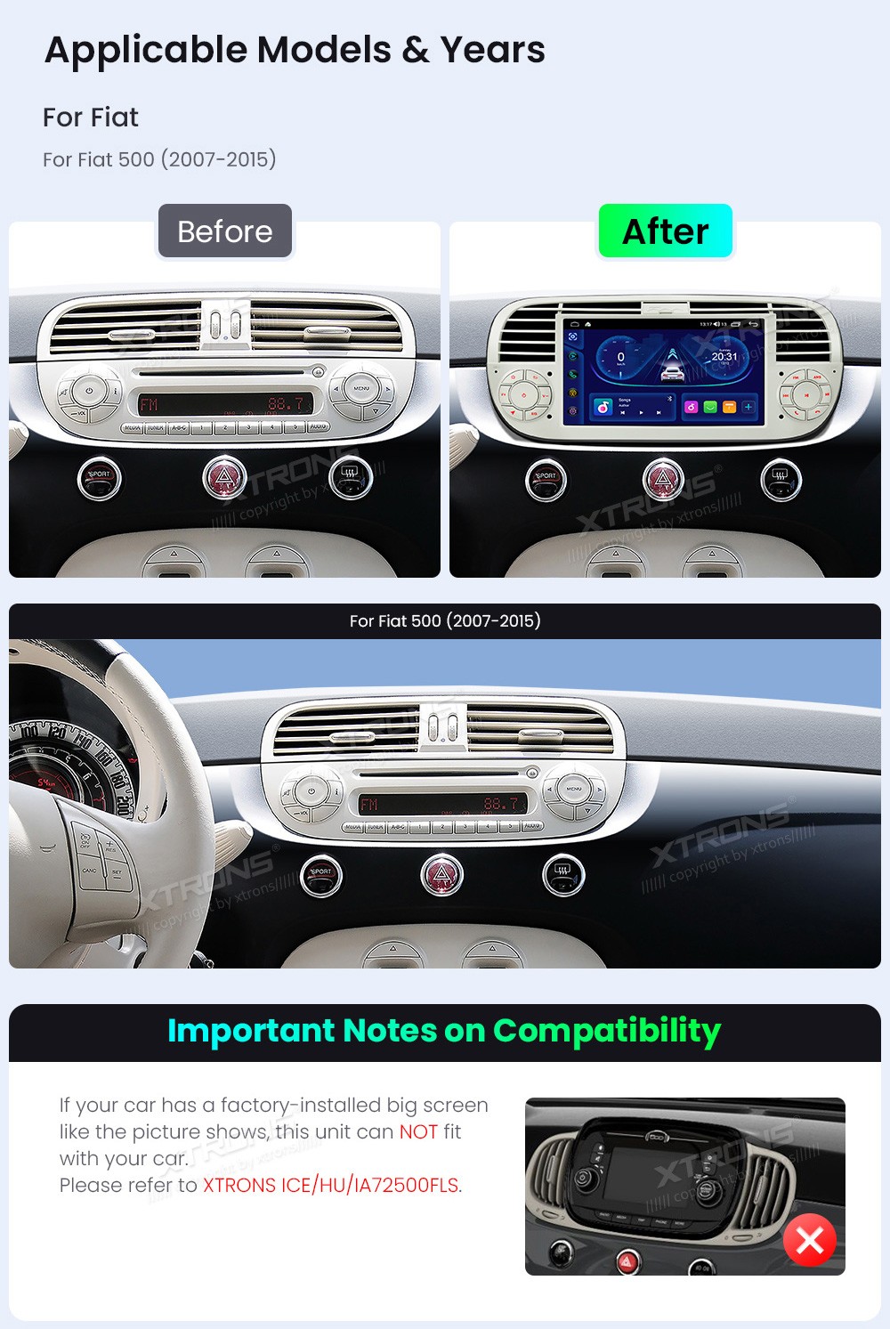 XTRONS IDS7050FLC 7.0" FIAT 500 Multimeedia Android Octa-Core FIAT 500 (2007-2015)Tarkvara: Android7.0" HD puuteekraan 1024*600px, IPSProtsessor 8xCortex-A55 Octa-Core 64bitMuutmälu 2GB, 64GB sisemäluGPS NavigatsioonCAR AutoPlay (Bluetooth ja USB) AndroidAuto (Bluetooth ja USB)HDMI väljund - Ei ...