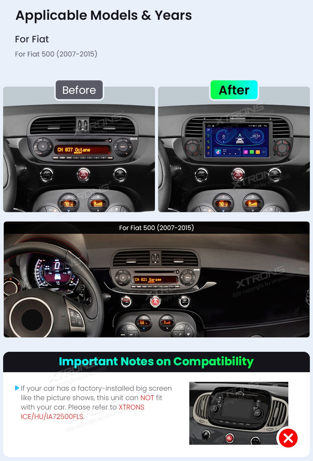 XTRONS IDS7050FLB 7.0" FIAT 500 Multimeedia Android Octa-Core FIAT 500 (2007-2015)Tarkvara: Android7.0" HD puuteekraan 1024*600px, IPSProtsessor 8xCortex-A55 Octa-Core 64bitMuutmälu 2GB, 64GB sisemäluGPS NavigatsioonCAR AutoPlay (Bluetooth ja USB) AndroidAuto (Bluetooth ja USB)HDMI väljund ...
