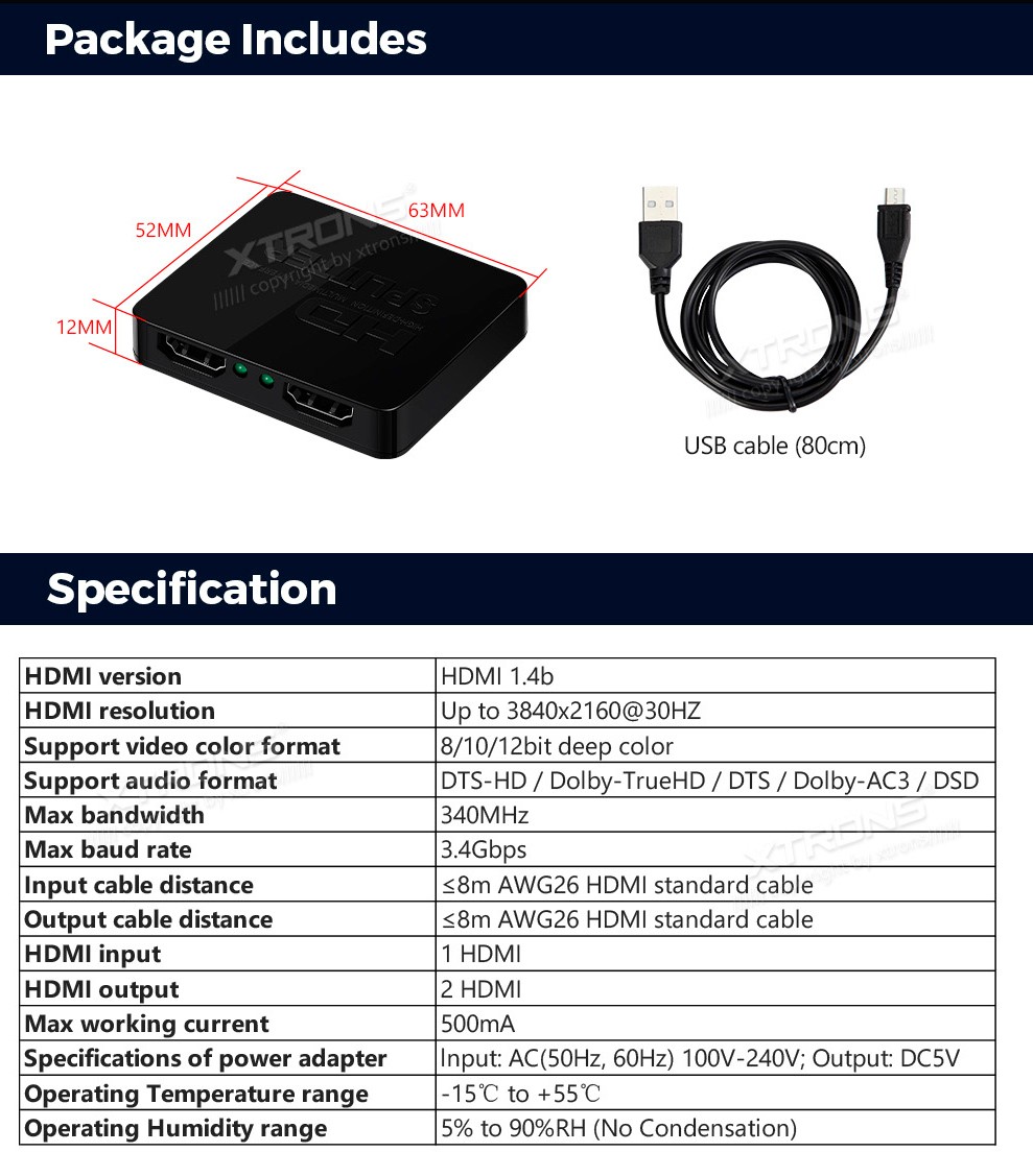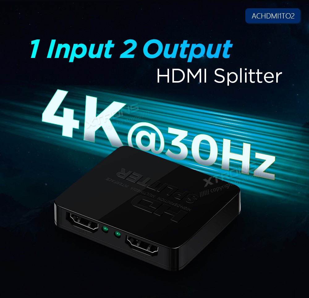 XTRONS ACHDMI1TO2 HDMI Jagaja1 Input 2 Output HDMI Splitter 4K 30HzSpecial Features*4K Ultra HD Resoiution*Support Full 3D/Dolby Audio/12-bit Color*Superior Signal Stability for Extended Ranges*High Quality ABS, more Durable ...