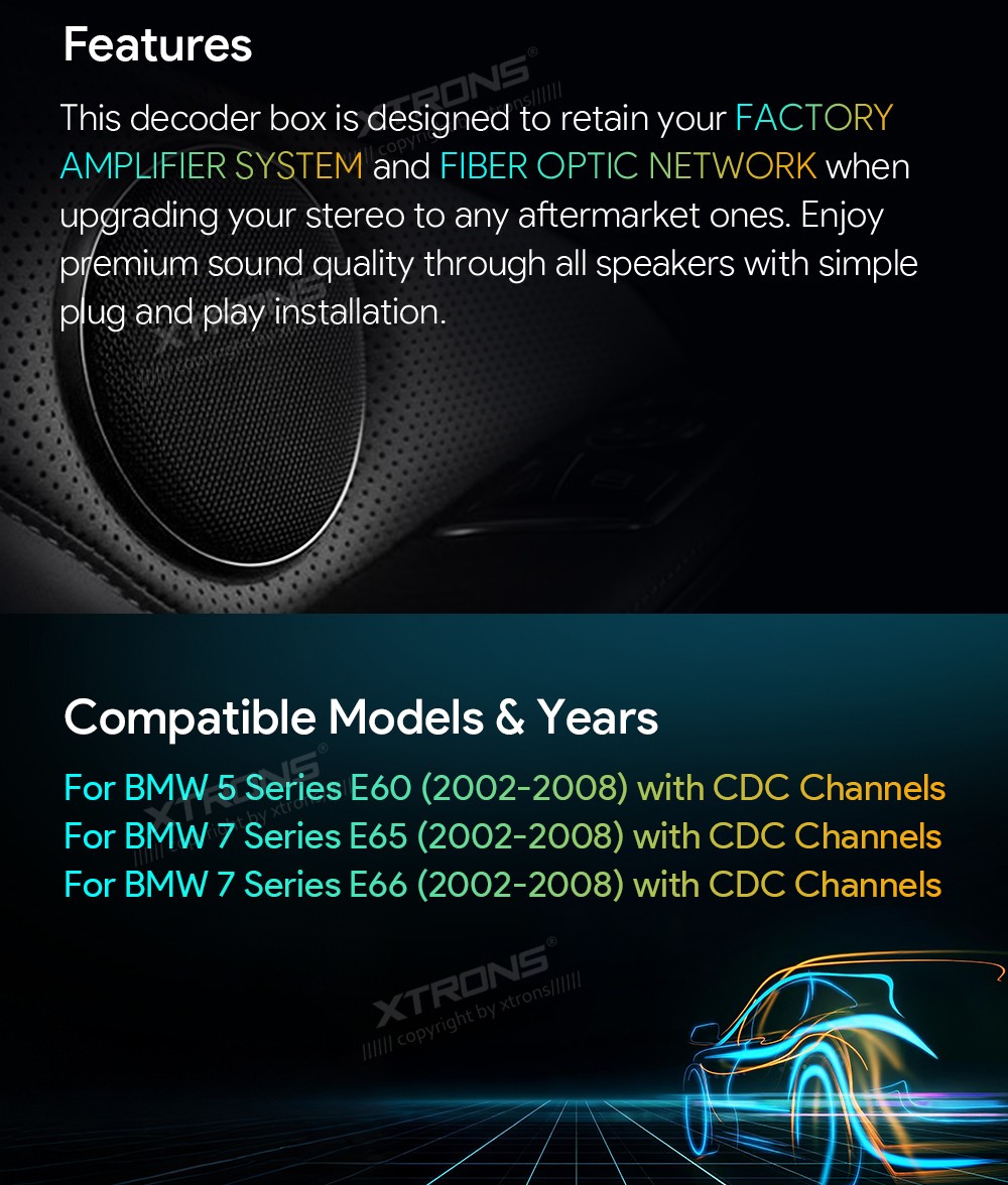 Kiudoptiline MOST25 dekooder BMW 5. seeria E60/7. seeria E65 E66 jaoks CDC kanalitega. Omadused: *Töötab AINULT enamiku siinipõhiste süsteemidega. *Ühilduvad mudelid ja aastad - BMW 5. seeria E60 (2002-2008) jaoks CDC kanalitega - BMW 7. seeria E65 (2002-2008) jaoks CDC kanalitega - BMW 7. seeria E66 (2002-2008) jaoks CDC kanalitega *See dekooder on loodud teie TEHASE VÕIMENDI SÜSTEEMI ja FIIBOPTILISE VÕRGU säilitamiseks stereosüsteemi järelturu versioonile uuendamisel. *Nautige esmaklassilist helikvaliteeti kõigist kõlaritest lihtsa pistikprogrammiga paigaldamise abil.