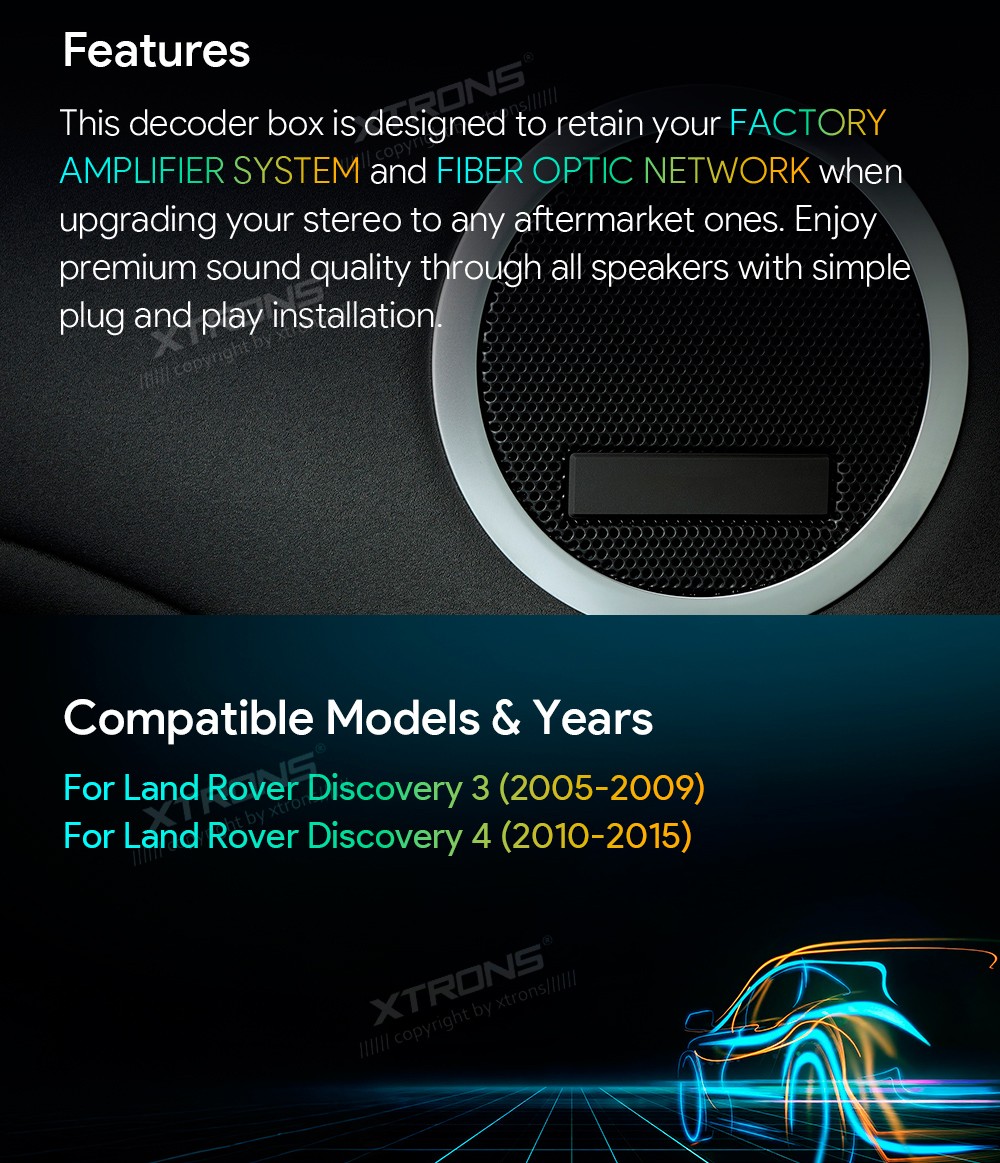 XTRONS ACFOBLRD01 Fiiberoptiline adapter MOST25 Land Rover Discovery 3, Discovery 4 *Töötab AINULT ENAMIKE bussipõhiste süsteemidega.*Ühilduvad mudelid ja aastad-Land Rover Discovery 3 (2005-2009) jaoks-Land Rover Discovery 4 (2010-2015) jaoks*See dekooder on loodud teie TEHASE VÕIMENDUSSÜSTEEM ...