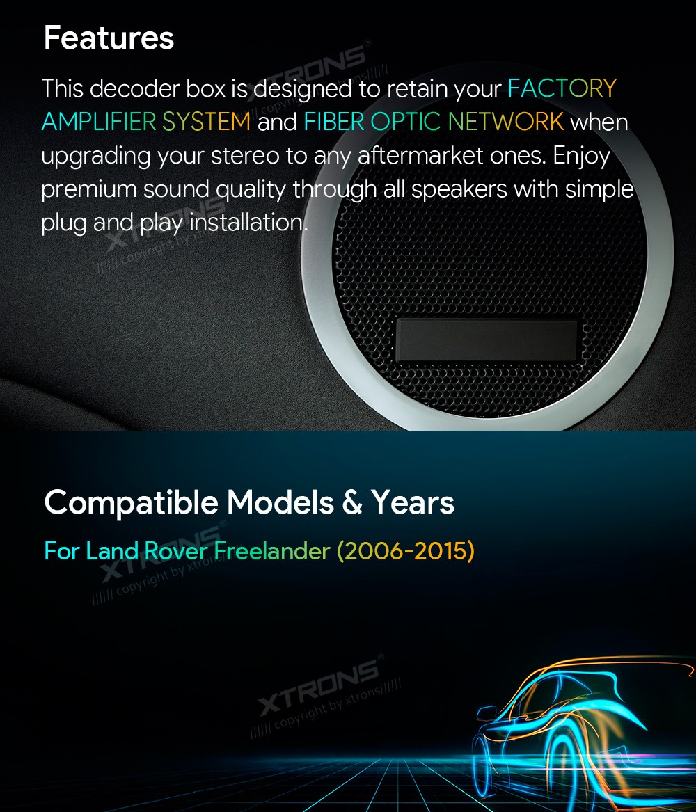 XTRONS ACFOBLRF01 Fiiberoptiline adapter MOST25 Land Rover Freelander Omadused:*Töötab AINULT ENAMIKE siinipõhiste süsteemidega.*Ühilduvad mudelid ja aastad-Land Rover Freelanderile (2006-2015)*See dekooder on loodud teie TEHASE VÕIMENDI SÜSTEEMI ja FIBEROPTILISE VÕRGU säilitamiseks, kui uuendate om ...