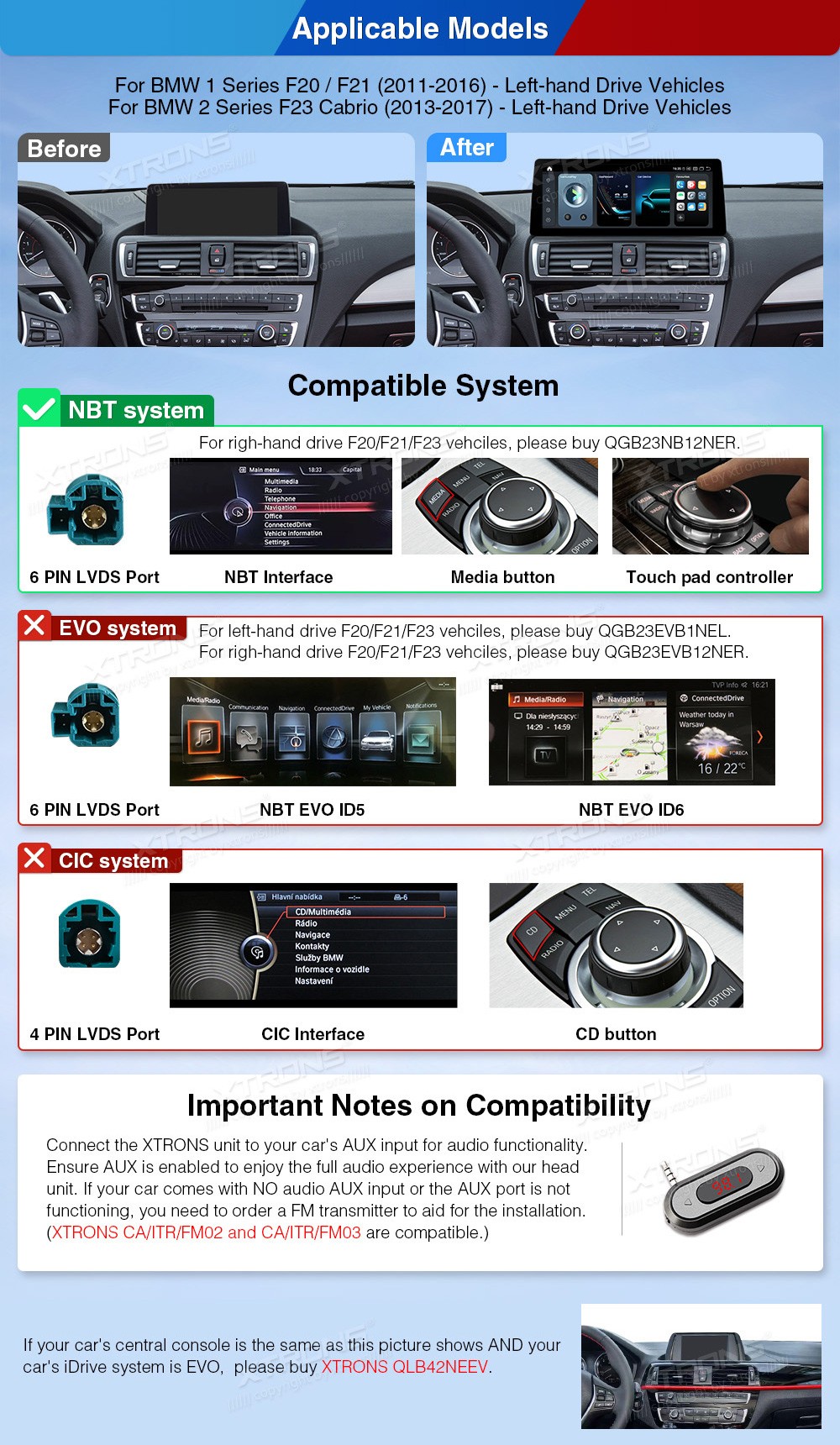 XTRONS QGB24NB1NEL 12.3" BMW 1, 2 Seeria, F20, F21, F23 Cabrio NBT Multimeedia Android 14.0 Octa-Core 4G BMW 1 Seeria F20, F21 (2011-2016)BMW 2 Seeria F23 Cabrio (2013-2017)(Sobib, kui sõidukil on NBT süsteem.)Tarkvara: Android 14.012.3" 2400*900px, 60Hz, IPS G+G HD puuteekraanProtsessor Octa ...Lisaseadmed