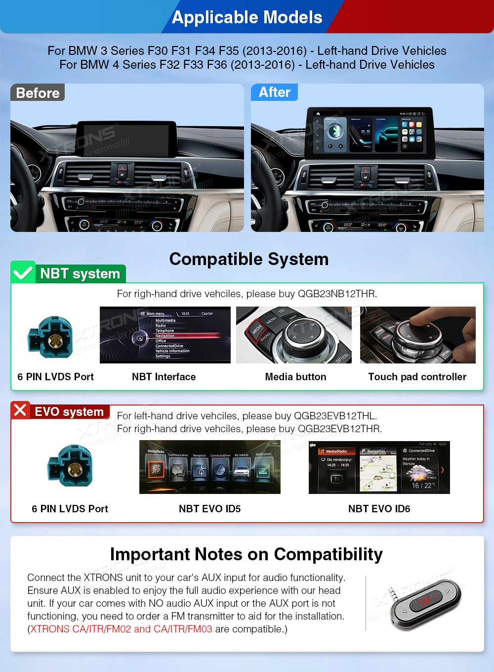 XTRONS QGB24NB12THL 12.3" BMW 3, 4 Seeria NBT Multimeedia Android 14.0 Octa-Core 4G BMW 3 Series F30, F31, F34, F35 (2013-2016)BMW 4 Series F32, F33, F36 (2013-2016)(Sobib, kui sõidukil on NBT süsteem.)Tarkvara: Android 14.012.3" 2400*900px, 60Hz, IPS G+G HD puuteekraanProtsessor Octa-Core Qualcomm ...Lisaseadmed