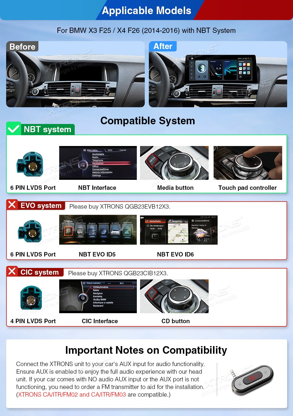 XTRONS QGB24NB12X3 12.3" BMW X3 F25, X4 F26 NBT Multimeedia Android 14.0 Octa-Core 4G BMW X3 F25 / X4 F26 (2014-2016) (Sobib, kui sõidukil on NBT süsteem.)Tarkvara: Android 14.012.3" 2400*900px, 60Hz, IPS G+G HD puuteekraanProtsessor Octa-Core Qualcomm Kryo 256 2.4GHz 64bit, 6nmMuutmälu LPDDR4 ...Lisaseadmed