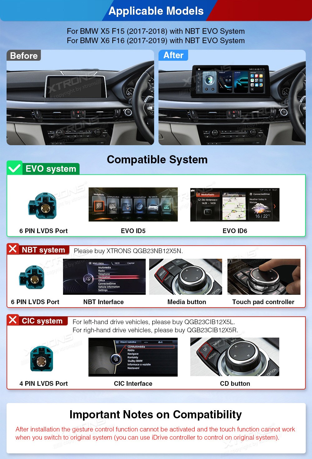 XTRONS QGB24EVB12X5N 12.3" BMW X5 F15, X6 F16 EVO Multimeedia Android 14.0 Octa-Core 4G BMW X5 F15 (2017-2018)BMW X6 F16 (2017-2019)(Sobib, kui sõidukil on EVO süsteem.)Tarkvara: Android 14.012.3" 2400*900px, 60Hz, IPS G+G HD puuteekraanProtsessor Octa-Core Qualcomm Kryo 256 2.4GHz 64bit, 6nmMuutmäl ...Lisaseadmed