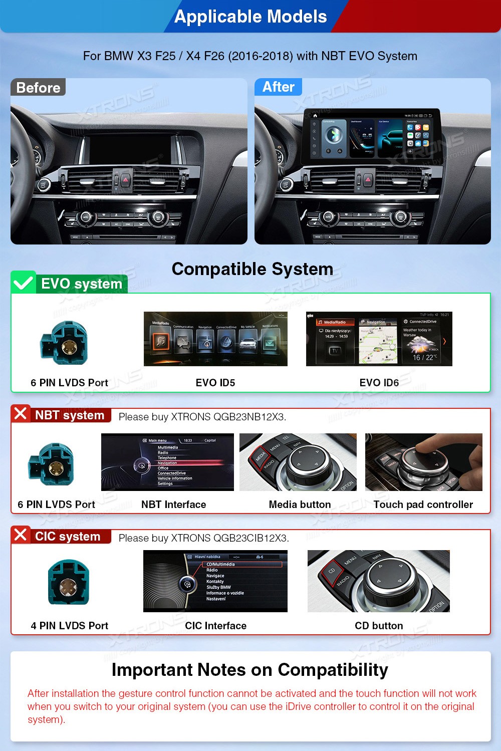 XTRONS QGB24EVB12X3 12.3" BMW X3 F25, X4 F26 EVO Multimeedia Android 14.0 Octa-Core 4G BMW X3 F25/X4 F26 (2016-2018) (Sobib, kui sõidukil on EVO süsteem.)Tarkvara: Android 14.012.3" 2400*900px, 60Hz, IPS G+G HD puuteekraanProtsessor Octa-Core Qualcomm Kryo 256 2.4GHz 64bit, 6nmMuutmälu LPDDR4 8GB, U ...Lisaseadmed