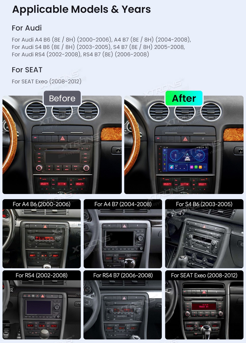 XTRONS IDS80A4AL 8.0" Audi A4, S4, RS4/SEAT Multimeedia Android Octa-Core Audi A4 B6 (8E / 8H) (2000-2006), A4 B7 (8E / 8H) (2004-2008), S4 B7 (8E / 8H) (2005-2008), S4 B6 (8E / 8H) (2003-2005), RS4 (2002-2008), RS4 B7 (8E) (2006-2008), SEAT Exeo (2008-2012)Tarkvara: Android8.0" HD puuteekraan 1 ...
