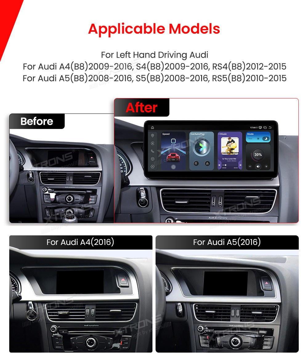 XTRONS QBA24A4CL 12.3" AUDI A4/A5 Multimeedia Android 14 Octa-Core 4G Audi A4, S4 (B8) (2009-2016), RS4 (B8) (2012-2015)Audi A5, S5 (B8) (2008-2016), RS5 (B8) (2010-2015)Tarkvara: Android 1412.3" HD puuteekraan 2400*900px, IPS HD G+G QLEDProtsessor Qualcomm Kryo 260 Octa-Core 64bit 2.0GHzM ...