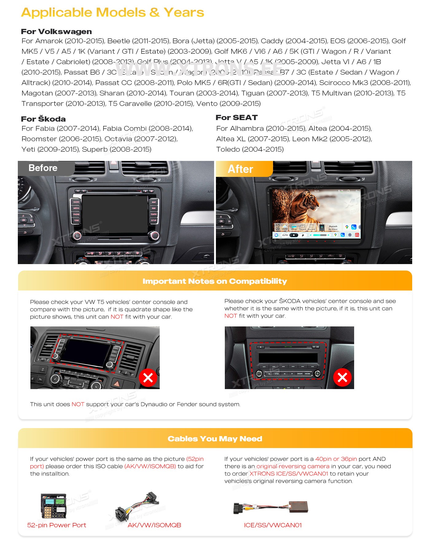 XTRONS IMH94MTVL 9.0" VOLKSWAGEN, SEAT, SKODA Multimeedia Android 14.0 Octa-Core 4G VolkswagenAmarok (2010-2015), Beetle (2011-2015), Bora (Jetta)(2005-2015), Caddy (2004-2015), EOS (2006-2015), Golf MK5/V5/A5/1K(Variant/GTI/Estate)(2003-2009), Golf MK6/VI6/A6/5K(GTI/Wagon/R/Variant/Estate/Cab ...