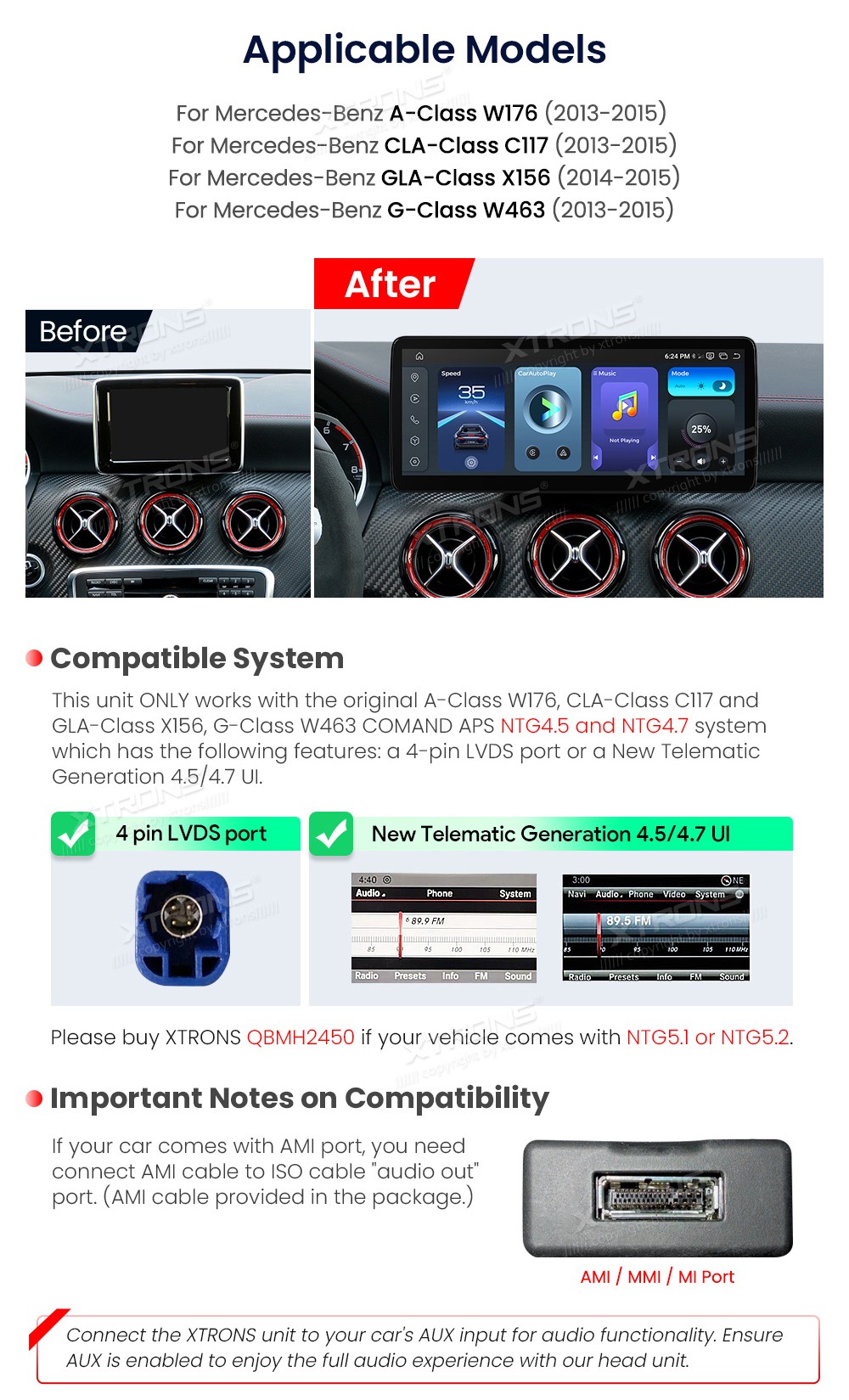 XTRONS QBMH2445 12.3" Mercedes-Benz Multimeedia Android 14.0 Octa-Core Mercedes-BenzA-Class W176(2013-2015) NTG 4.5 and NTG 4.7 System. CLA-Class C117(2013-2015)NTG 4.5 and NTG 4.7 System. GLA-Class X156(2014-2015) NTG 4.5 and NTG 4.7 System.G-Class W463(2013-2015) NTG 4.5 and NTG 4.7 ...