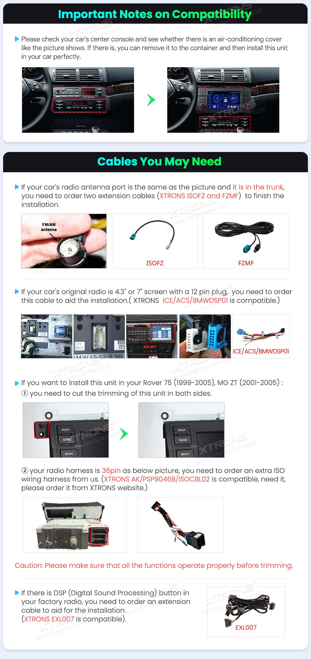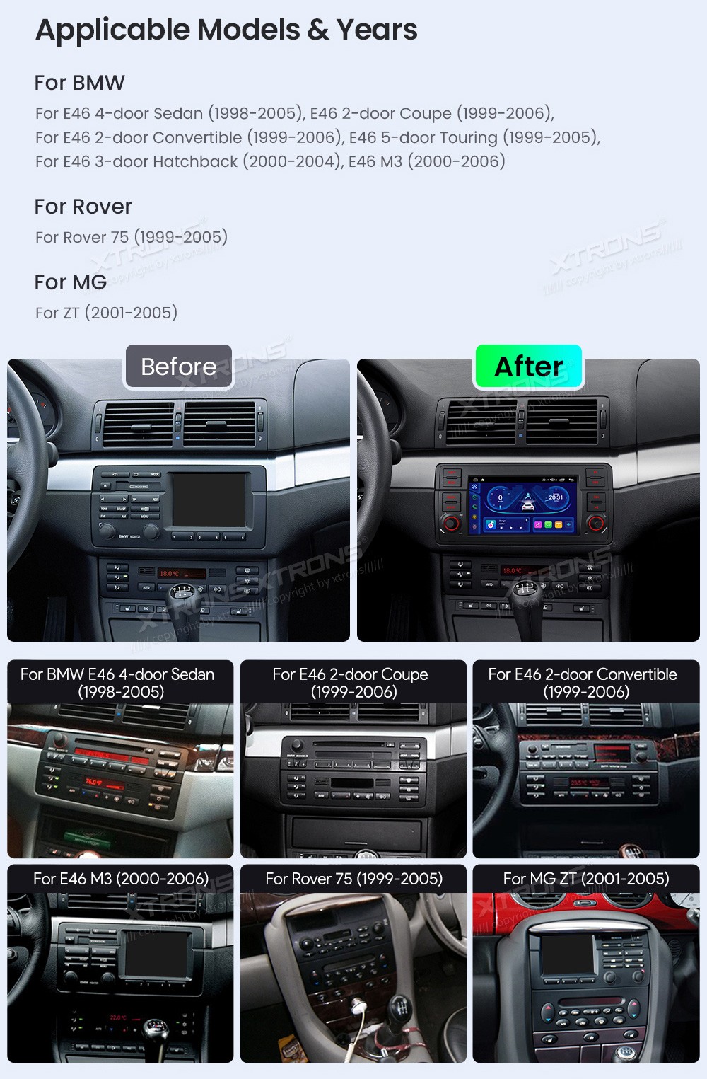 XTRONS IDS7046BL 7.0" BMW E46/Rover/MG Multimeedia Android Octa-Core BMW E46 4-door Sedan (1998-2005), E46 2-door Coupe; (1999-2006), E46 2-door Convertible (1999-2006), E46 5-door Touring (1999-2005), E46 3-door Hatchback (2000- 2004), E46 M3 (2000-2006)Rover 75 (1999-2005)MG ZT (2001 ...