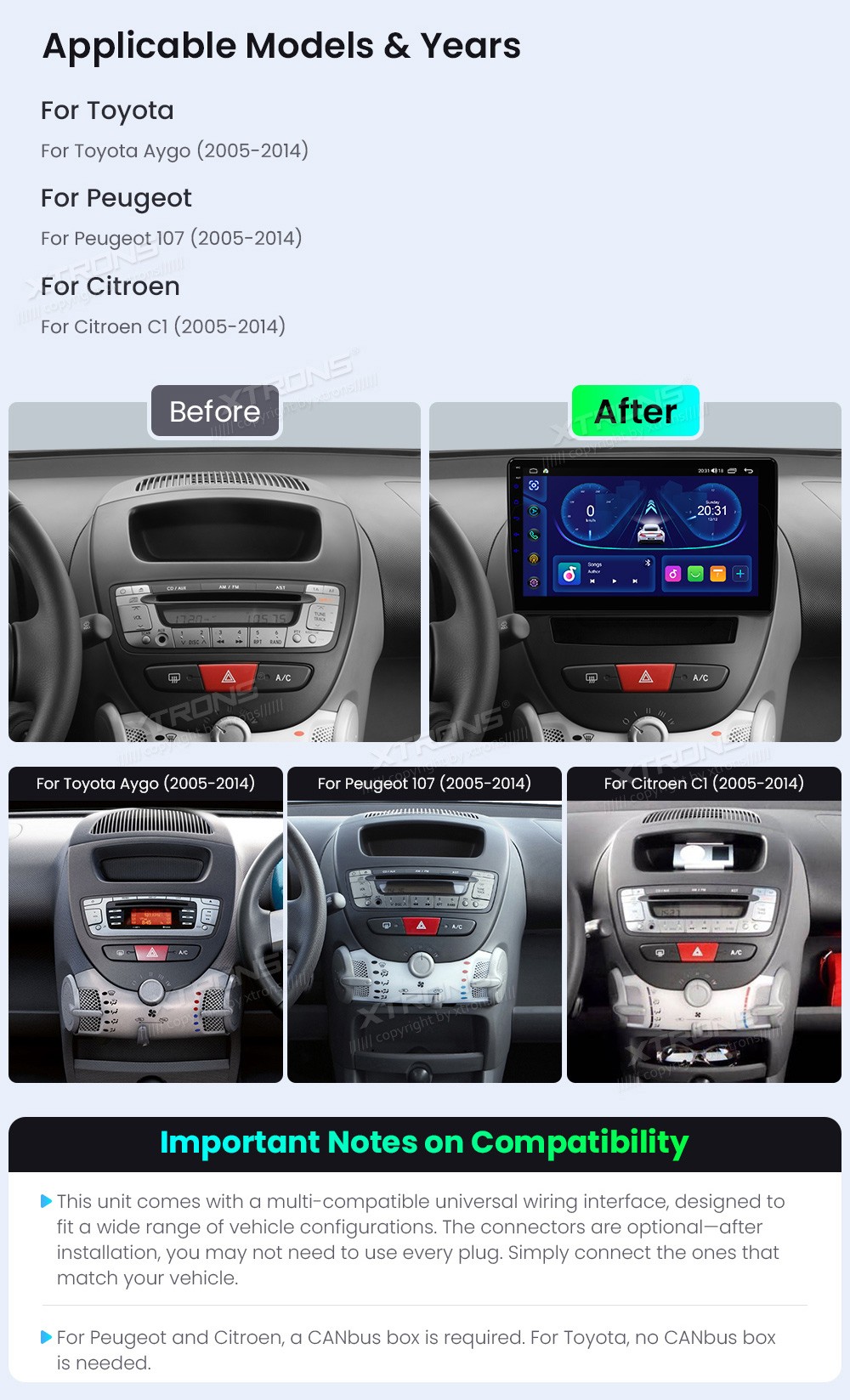 XTRONS IDSP10AGT 10.1" Citroen C1 Multimeedia Android Octa-Core Toyota Aygo / Peugeot 107 / Citroen C1 (2005-2014)Tarkvara: Android10.1" HD puuteekraan 1280*720px, G+G IPSProtsessor 8xCortex-A55 Octa-Core 64bitMuutmälu 2GB, 64GB sisemäluGPS NavigatsioonCAR AutoPlay (Bluetooth ja USB) Andro ...